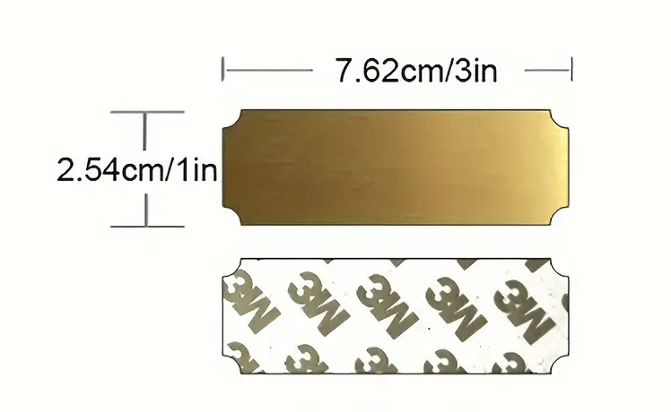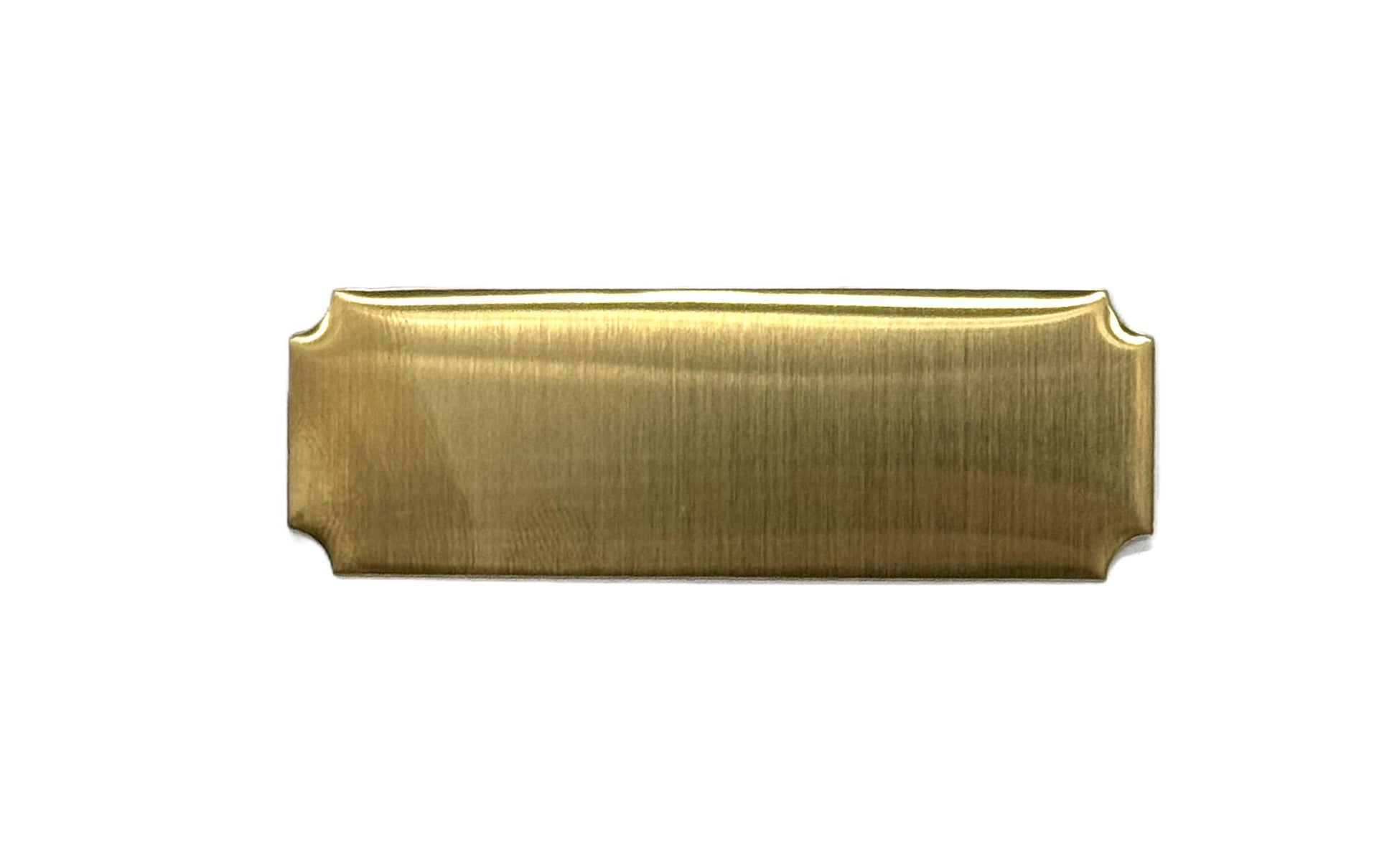 Guldfärgad namnskylt av metall, längd ca 7,5 cm, höjd ca 2,7 cm. Lim/tejp på baksidan.