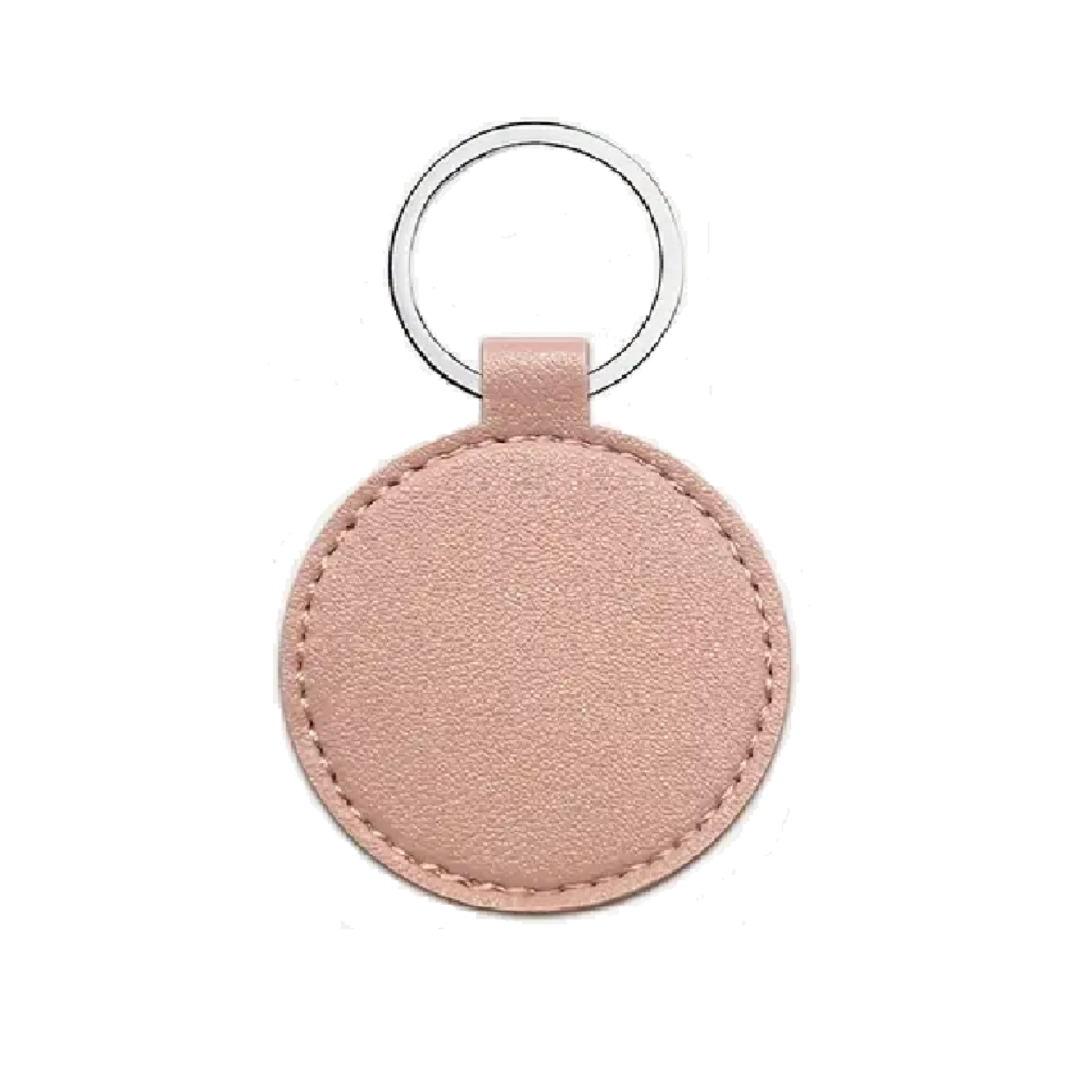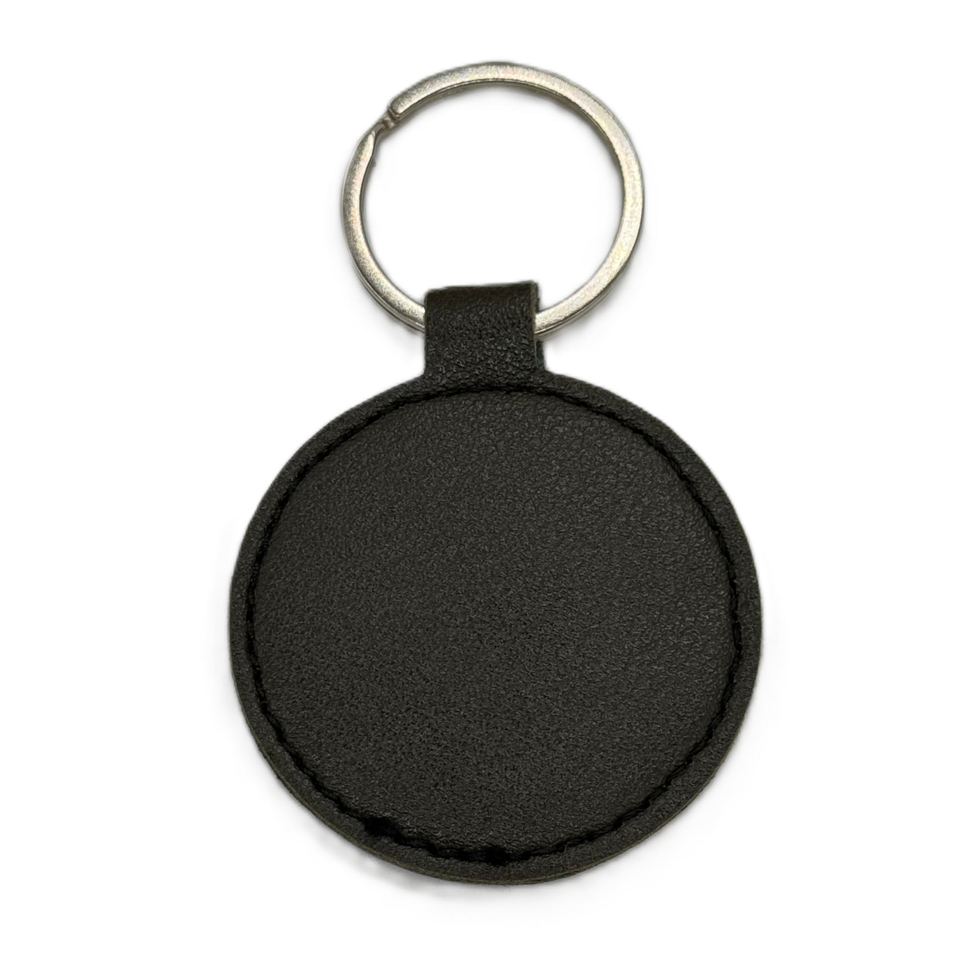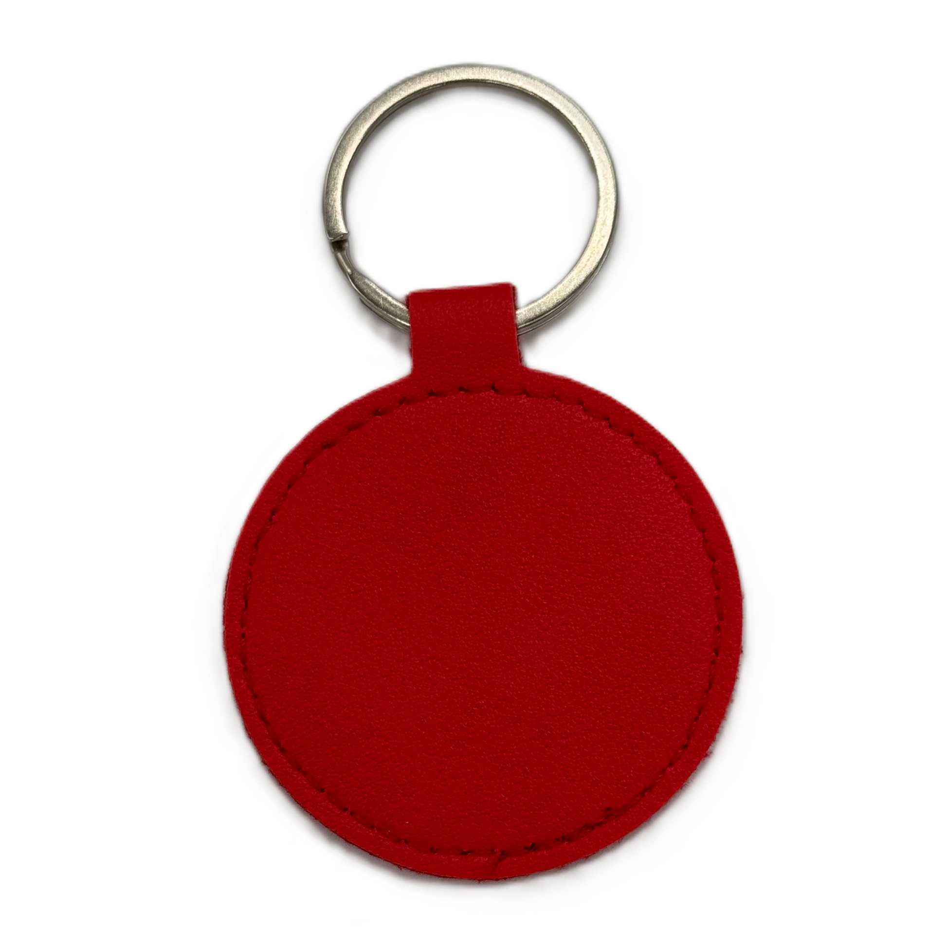 Nyckelring i läder i olika färger. Nyckelringen är rund till formen med en diameter på ca 5 cm.
